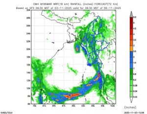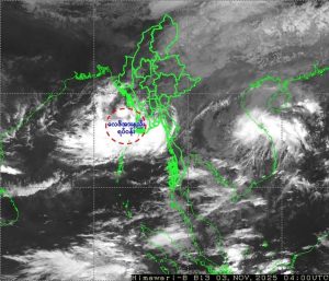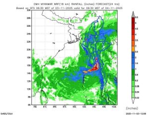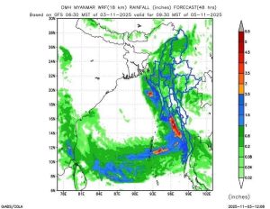 မြန်မာနိုင်ငံ မြစ်ဝကျွန်းပေါ်ကမ်းရိုးတန်းဒေသအနီးတွင်ဖြစ်ပေါ်နေသော လေဖိအားနည်းရပ်ဝန်းအရှိ န်ကြောင့် နိုဝင်ဘာ ၃ ရက်မှ ၆ ရက်အတင်း တိုင်းနှင့်ပြည်နယ် နေရာစိပ်စိပ်မှ နေရာအနှံ့အပြား မိုးထစ်ချုန်းရွာပြီး အချို့ဒေသများတွင် ဒေသလိုက်နှင့်နေရာကွက်၍ မိုးကြီးမည်ဖြစ်ကြောင်းပါဝင်သည်။