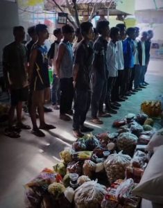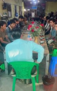 (ရဲမွန်တောင်ရပ်ကွက်က ပျူစောထီးအဖွဲ့တွေ ရှေ့တန်းကပြန်လာပြီးစားသောက်နေစဉ်နဲ့ ရှေ့တန်းမထွက်မီတွေ့ရစဉ်။ ဓာတ်ပုံ – CJ)
