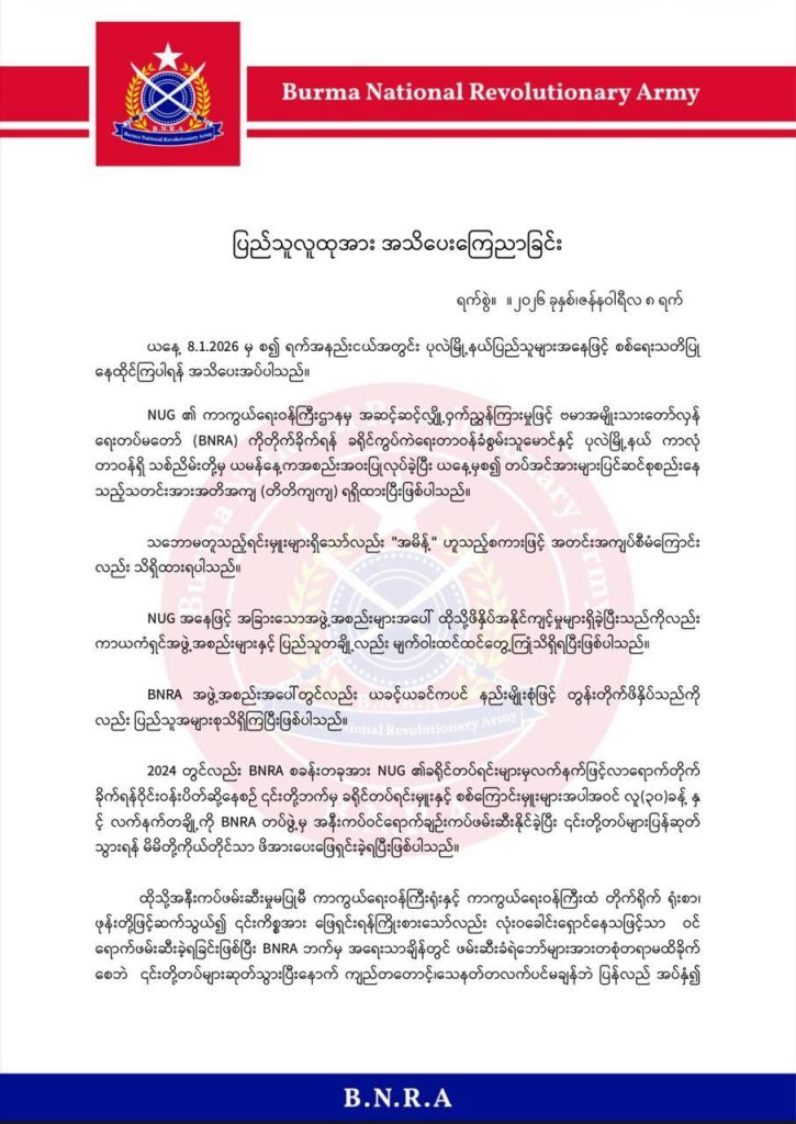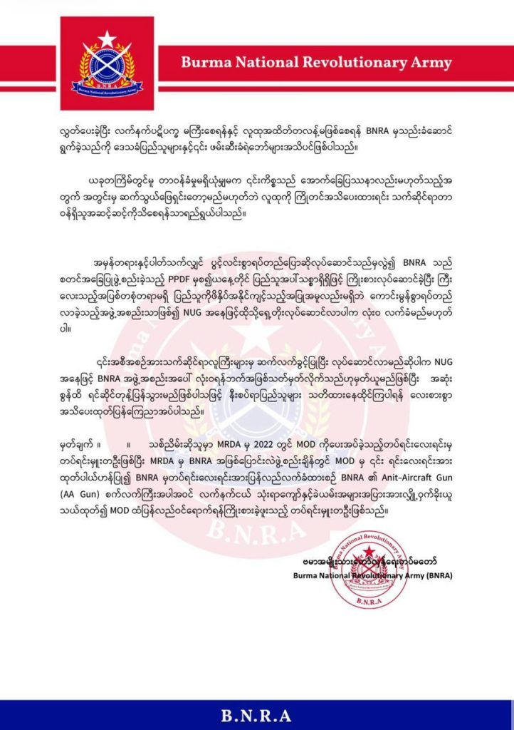 NUG အနေနဲ့ ရှေ့တိုး လုပ်ဆောင်လာပါက လုံးဝလက်ခံမှာ မဟုတ်ဘဲ BNRA အနေနဲ့ အဆုံးစွန်ထိ ရင်ဆိုင်တုန့်ပြန်သွားမယ်လို့ ဖေါ်ပြထား ပါတယ်။