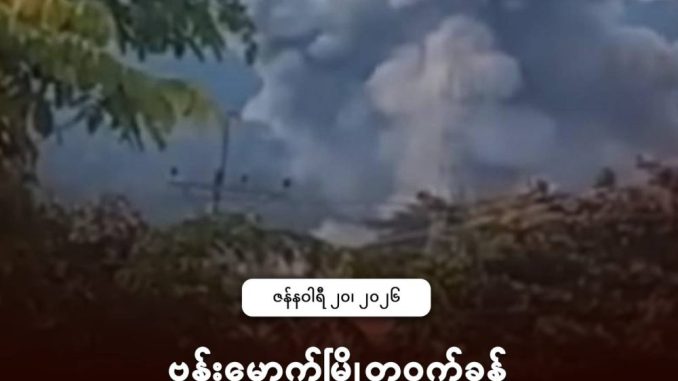 ပုံစာ- ဇန်နဝါရီ ၁၅ ရက်က ဗန်းမောက် Royal Golden City Hotel ကို ဗုံးကြဲ၍ မီးလောင်နေစဉ်/”CJ”