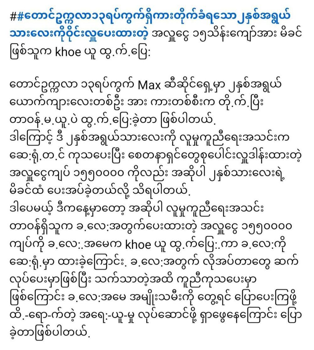 “သားလေးကားတိုက်ခံရတာကို လာလှူတဲ့ အလှူငွေတွေကို ခိုးပြေးတဲ့ အမေတဲ့” February 7, 2026 admin Finance 0 “သားလေးကားတိုက်ခံရတာကို လာလှူတဲ့ အလှူငွေတွေကို ခိုးပြေးတဲ့ အမေတဲ့” 3