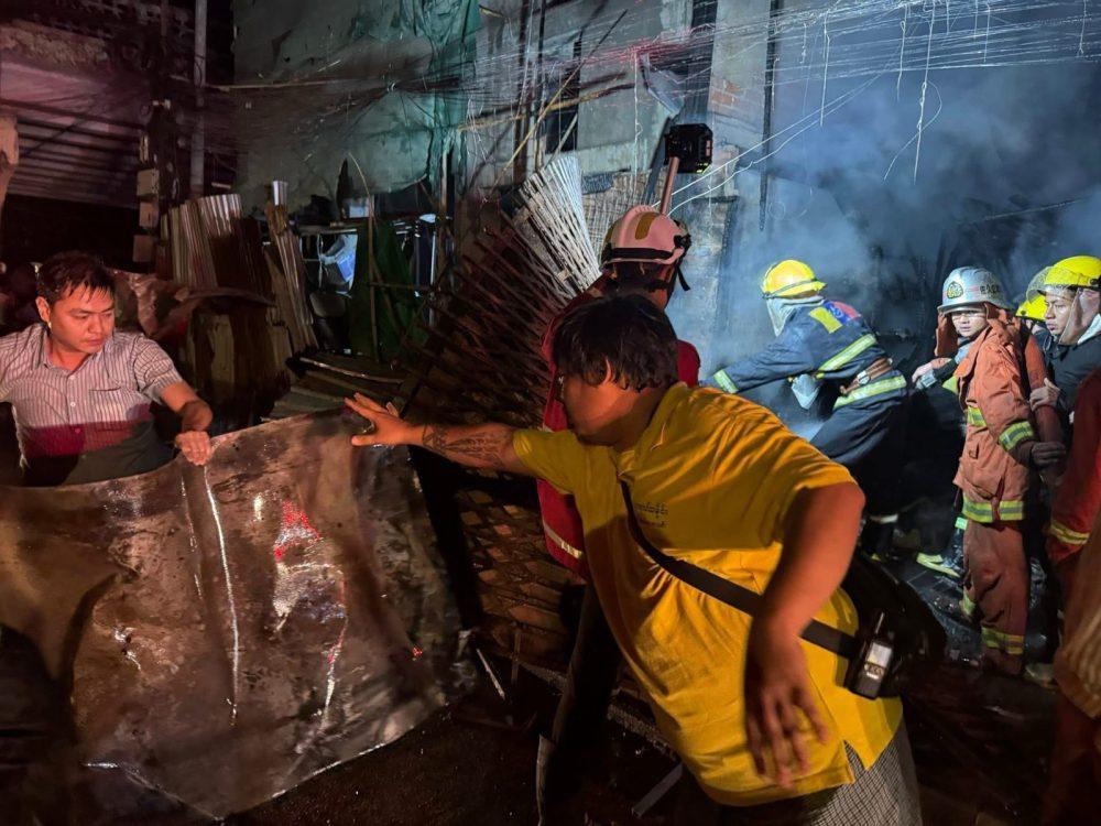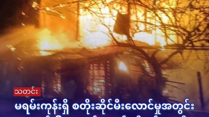 ဓာတ်ပုံ – ရန်ကုန်တိုင်းဒေသကြီး၊ မရမ်းကုန်းမြို့နယ်ရှိ နေအိမ်နှင့်တွဲဖွင့်ထားသော စတိုးဆိုင်တစ်ဆိုင် မီးလောင်စဥ်၊ ဖေဖော်ဝါရီ ၁၅ ရက် နံနက်အစောပိုင်းတွင် မီးလောင်ကျွမ်းမှုဖြစ်ပွားခဲ့ရာ အိမ်အတွင်းရှိနေသည့် အသက် ၆၀ ကျော်အရွယ် ညီအစ်မနှစ်ဦး မီးလောင်သေဆုံးခဲ့ကြောင်း ဒေသခံများနှင့် လူမှုကူညီရေးအသင်းများထံက သိရသည်။ (ရွှေရောင်သမိုင်း)