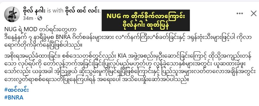 အဲဒီ မတိုင်ခင် NUG တပ်ရင်းတချို့နဲ့ BNRA အကြေား အပြန်လှန် ဂိတ်တွေကို ဝင်စီးတဲ့ အငြင်းပွားမှု တွေလည်း ဖြစ်ပေါ်ခဲ့ဖူးပါတယ်။