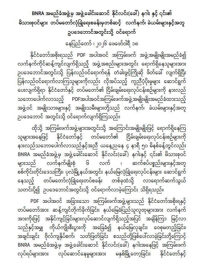 ဗိုလ်နဂါးဦးဆောင်သည့် BNRAတပ်သည် လူထုအပေါ် ဖိနှိပ်မှုနှင့် ရာဇဝတ်မှုများအပြင် NUG လက်အောက်ခံ အရပ်ဘက် ဝန်ထမ်းများအပေါ် ကျူးလွန်ထားသည့် ပြစ်မှုများကြောင့် ကာကွယ်ရေးဝန်ကြီးဌာနကို အကူအညီတောင်းပြီး ဖမ်းဆီးအရေး ယူနိုင်ရေး ဆောင်ရွက်ရခြင်းဖြစ်ကြောင်း NUG ပြည်ထဲရေးနှင့် လူဝင်မှုကြီးကြပ်ရေးဝန်ကြီးဌာန ဒုဝန်ကြီးဦးကျော်နီက လူထုနွေဦးကို ပြောထားသည်။
