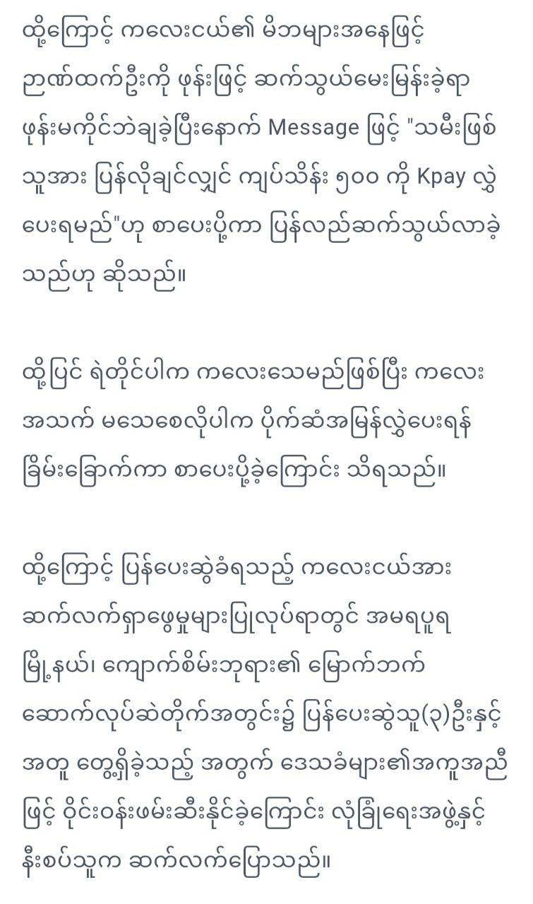 “မန္တလေးမှာ ၄နှစ်သမီးကို ပြန်ပေးဆွဲပြီး သိန်း ၅၀၀ တောင်းတဲ့သူက ဘယ်လှုမှထင်မထားတဲ့သူဖြစ်နေ ကြောက်စရာပဲ ခေတ်ကာလကြီးက”