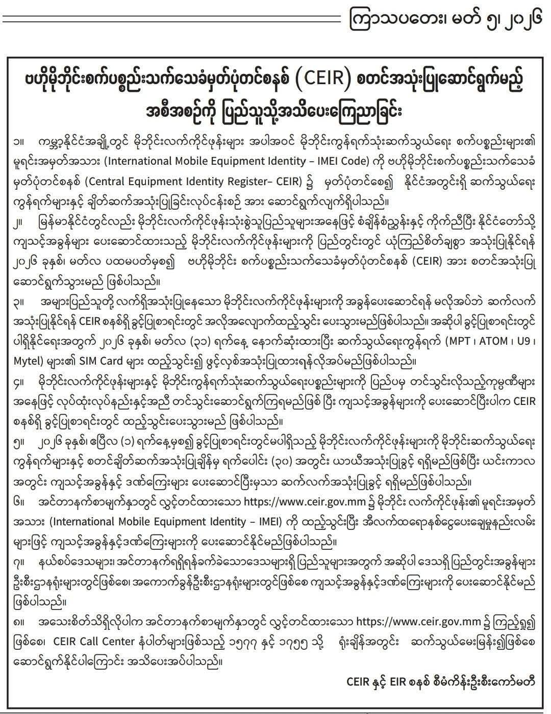 ဧပြီလ ၁ရက်နေ့ကျရင်တော့ CEIR စနစ် စတင်ပြီမို့ အခွန်မဆော.င်ထားတဲ့ ဖုန်းတွေ (ဥပမာ ပြည်ပကနေ ကိုယ်တိုင် ဝယ်လာတဲ့ ဟန်းဆက်တွေ… စသဖြင့်) အသုံးပြုချင်တယ်ဆိုရင် အခွန်နဲ့ ဒ-ဏ်ကြေ:တွေကို သ.-တ်မှ.-တ်ထားတဲ့ ရက်ပေါင်း ၃၀ အတွင်း ပေးဆောင်မှသာ ပြန်လည် အသုံးပြုခွင့် ရရှိမှာ ဖြစ်ပါတယ်တဲ့.
