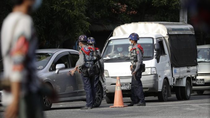 ဓာတ်ပုံ- ရန်ကုန်တွင် ကားများကို စစ်ဆေးနေသည့် အကြမ်းဖက် စစ်တပ်လက်အောက်ခံ ရဲများ။ (ပုံအဟောင်းကို အသုံးပြုထားပါသည်။)
