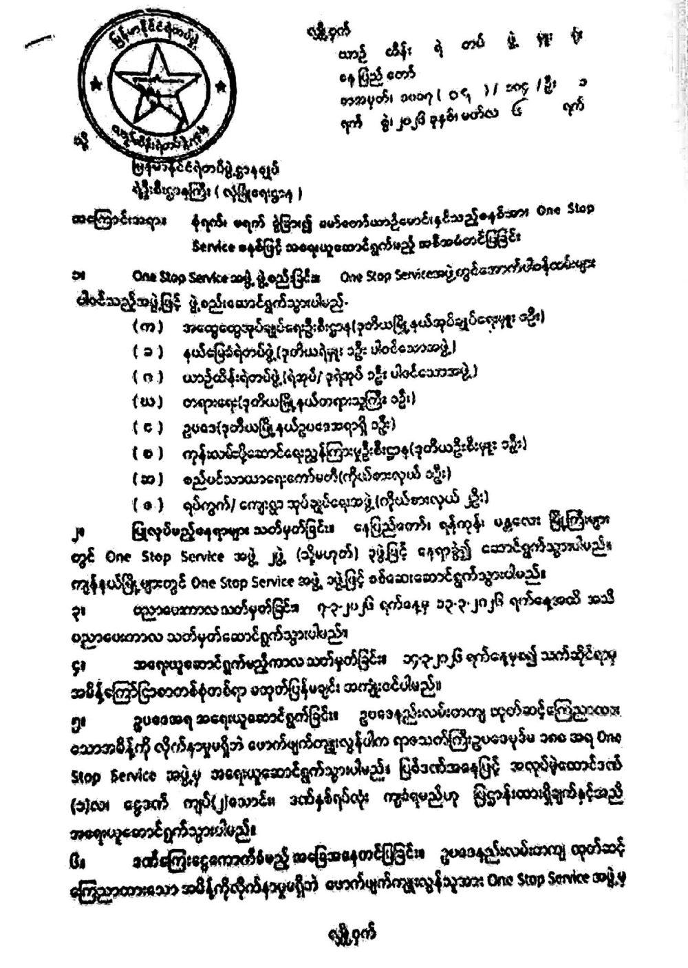 နေပြည်တော်ရှိ ယာဉ်ထိန်းရဲတပ်ဖွဲ့မှူးရုံး၏ မတ်လ ၆ ရက်နေ့စွဲဖြင့် ထွက်ရှိထားသည့် လျှို့ ဝှက်အမိန့်အရ အဆိုပါကိစ္စကို အရေးယူဆောင်ရွက်ရန်အတွက် ဌာနစုံ ပါဝင်သော One Stop Service အဖွဲ့များကို ဖွဲ့စည်းသွားမည် ဖြစ်ကြောင်း၊ ယင်းအဖွဲ့တွင် အထွေထွေအုပ် ချုပ်ရေးဦးစီးဌာန၊ ရဲတပ်ဖွဲ့၊ ယာဉ်ထိန်းရဲတပ်ဖွဲ့၊ တရားရေးဌာန၊ ဥပဒေရုံး၊ ကုန်းလမ်းပို့ ဆောင်ရေးညွှန်ကြားမှုဦးစီးဌာန၊ စည်ပင်သာယာရေးကော်မတီနှင့် ရပ်ကွက်/ကျေးရွာ အုပ်ချုပ်ရေးအဖွဲ့များမှ တာဝန်ရှိသူများ ပါဝင်မည် ဖြစ်ကြောင်း သိရှိရသည်။