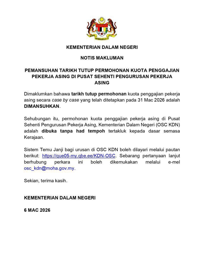Kementerian Dalam Negeri (KDN) memaklumkan bahawa tarikh tutup permohonan kuota penggajian pekerja asing secara “case by case” yang sebelum ini ditetapkan pada 31 Mac 2026 adalah DIMANSUHKAN.