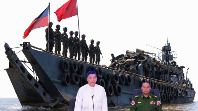 ဓာတ်ပုံ- ရခိုင်ပြည်နယ်ဝန်ကြီးချုပ်ထိန်လင်း၊ အနောက်ပိုင်းတိုင်းစစ်ဌာနချုပ်တိုင်းမှူး ကျော်စွာဦးတို့၏ ဓာတ်ပုံနှင့် AA က စစ်တပ်၏ စစ်သင်္ဘော ၁ စီးကို သိမ်းပိုက်ခဲ့သော ဓာတ်ပုံကို AI ဖြင့် ပြန်လည် ယှဉ်တွဲ ဖော်ပြထားခြင်းဖြစ်ပါသည်။