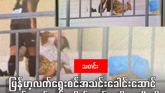 ဓာတ်ပုံ – ပွဲကြည့်စင်ပေါ်၌ ပရိသတ်အမျိုးသမီးတဦးကို ထိုးကြိတ်နေသည့် မြန်မာ့လက်ရွေးစင်အသင်းခေါင်းဆောင် မောင်မောင်လွင်ကို တွေ့ရစဉ်။ ရန်ကုန်တိုင်း သန်လျင် သီဟဒီပကွင်း၌ မတ်လ ၁၀ရက်နေ့က ပြုလုပ်ခဲ့သည့် မြန်မာနေရှင်နယ်လိဂ်ပွဲစဉ်တွင် မြန်မာ့လက်ရွေးစင်အသင်းခေါင်းဆောင် မောင်မောင်လွင်က ပွဲလာရောက်ကြည့်ရှုသည့် ပရိတ်သတ်အမျိုးသမီးတဦးကို ပွဲကြည့်စင်ပေါ်တက်၍ ကိုယ်ထိလက်ရောက်ကျူးလွန်မှု ဖြစ်ပွားခဲ့ကြောင်း ဘောလုံးအဖွဲ့ချုပ်နှင့် နီးစပ်သူများထံမှ မဇ္ဈိမ စုံစမ်းသိရသည်။