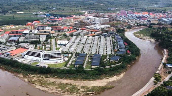 ဓာတ်ပုံ- မြန်မာနိုင်ငံဘက်အခြမ်းရှိ KK Park ကျားဖြန့်ဝင်းကို ထိုင်းနိုင်ငံဘက်မှ ဒရုန်းဖြင့် မြင်ရစဉ်။