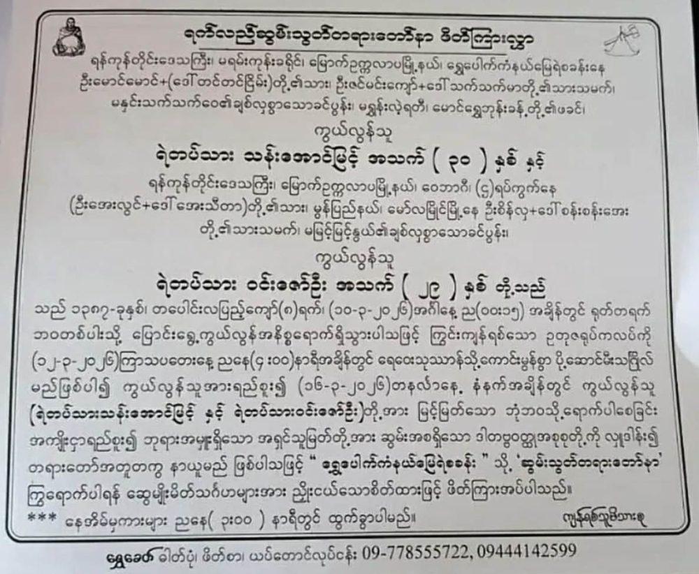 အသက်(၂၉)နှစ်အရွယ် စစ်ကောင်စီ ရဲတပ်သား ဝင်းဇော်ဦးနဲ့ အသက်(၃၀)အရွယ် ရဲတပ်သား သန်းအောင်မြင့်ရဲ့ ရုပ်အလောင်းတွေကို ရေဝေးသုဿန်မှာ မီးသင်္ဂြိုလ်မယ်လို့ နာရေးဖိတ်စာမှာဖော်ပြထား ပါတယ်။