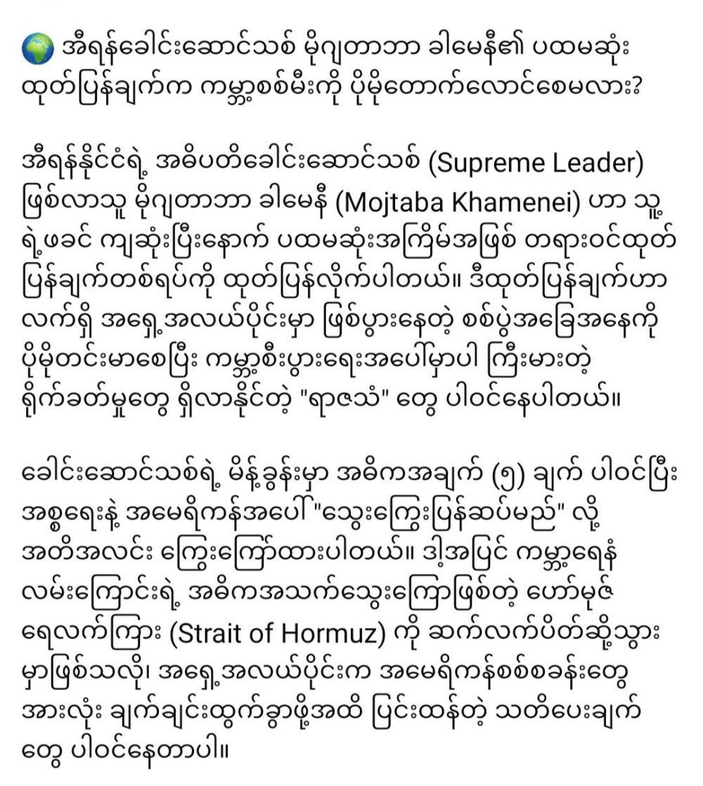 “သွေးကြွေးပြန်ဆပ်မည်! အီရန်ခေါင်းဆောင်သစ် ကြွေးကြော်” March 15, 2026 admin News 0 “သွေးကြွေးပြန်ဆပ်မည်! အီရန်ခေါင်းဆောင်သစ် ကြွေးကြော်”