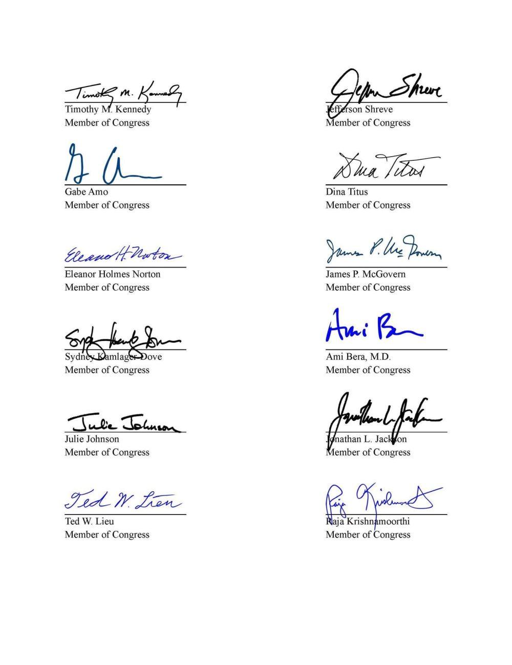 အဆိုပါ တောင်းဆိုချက်ကို အမေရိကန်လွှတ်တော်အမတ်များဖြစ်သည့် Gregory W. Meeks (Ranking Member, House Foreign Affairs Committee) နှင့် Bill Huizenga တို့ ဦးဆောင်ကာ Timothy M. Kennedy, Jefferson Shreve, Gabe Amo, Dina Titus, Eleanor Holmes Norton, James P. McGovern, Sydney Kamlager-Dove, Ami Bera, Julie Johnson, Jonathan L. Jackson, Ted W. Lieu နှင့် Raja Krishnamoorthi စသည့် လွှတ်တော်အမတ် ၁၄ ဦးက စုပေါင်းလက်မှတ်ရေးထိုး ပေးပို့ခဲ့ခြင်းဖြစ်သည်။