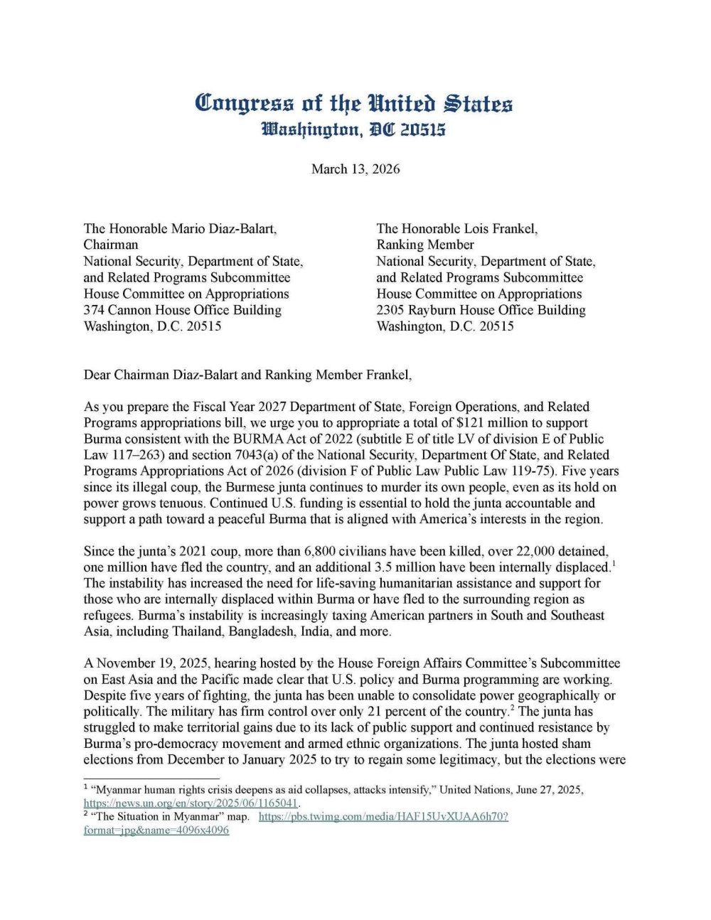 စစ်အာဏာသိမ်းထားသော မြန်မာနိုင်ငံ၏ ဆိုးရွားလာနေသော လူသားချင်းစာနာမှုဆိုင်ရာ အကျပ် အတည်းများကို ဖြေရှင်းရန်နှင့် ဒီမိုကရေစီအရေး လှုပ်ရှားမှုများကို ကူညီရန်အတွက် လာမည့် ၂၀၂၇ ခုနှစ်ဘဏ္ဍာရေးနှစ်တွင် ရန်ပုံငွေ အမေရိကန်ဒေါ်လာ ၁၂၁ သန်း လျာထားသတ်မှတ်ပေးရန် အမေရိကန်ကွန်ဂရက်လွှတ်တော်အမတ် ၁၄ ဦးက မတ်လ ၁၃ ရက်နေ့တွင် စုပေါင်း လက်မှတ်ရေးထိုးတိုက်တွန်းတောင်းဆိုလိုက်သည်။