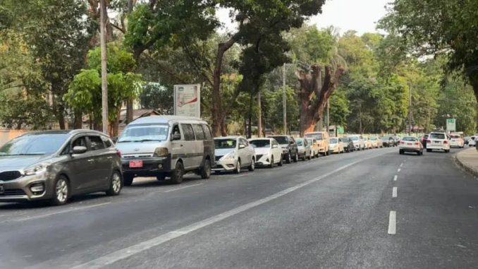 (ရန်ကုန်မြို့မှာ စက်သုံဆီရဖို့စီတန်းနေကြတဲ့ ကားတွေကို တွေ့ရစဉ်။ ဓာတ်ပုံ – CJ)