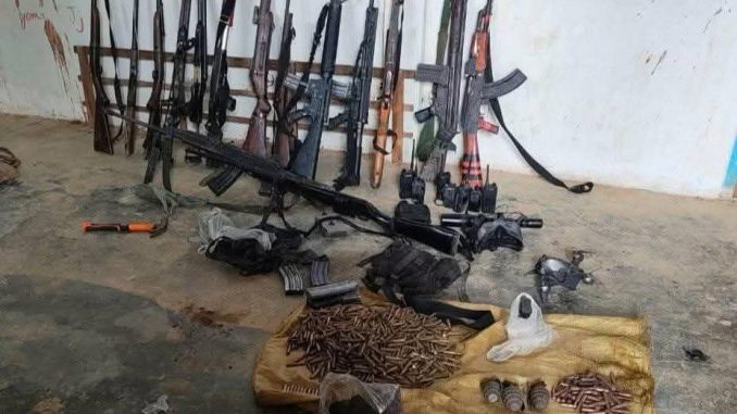 (People Defense Army (PDA)ရဲ့ တပ်စခန်းကို စစ်ကောင်စီတပ် လက်ပါးစေ ဇိုမီးတပ်(ZRA)က ဝင်ရောက်စီးနင်းပြီး သိမ်းသွားသော လက်နက်တွေ။ ဓာတ်ပုံ – Peter Kimm Thang)