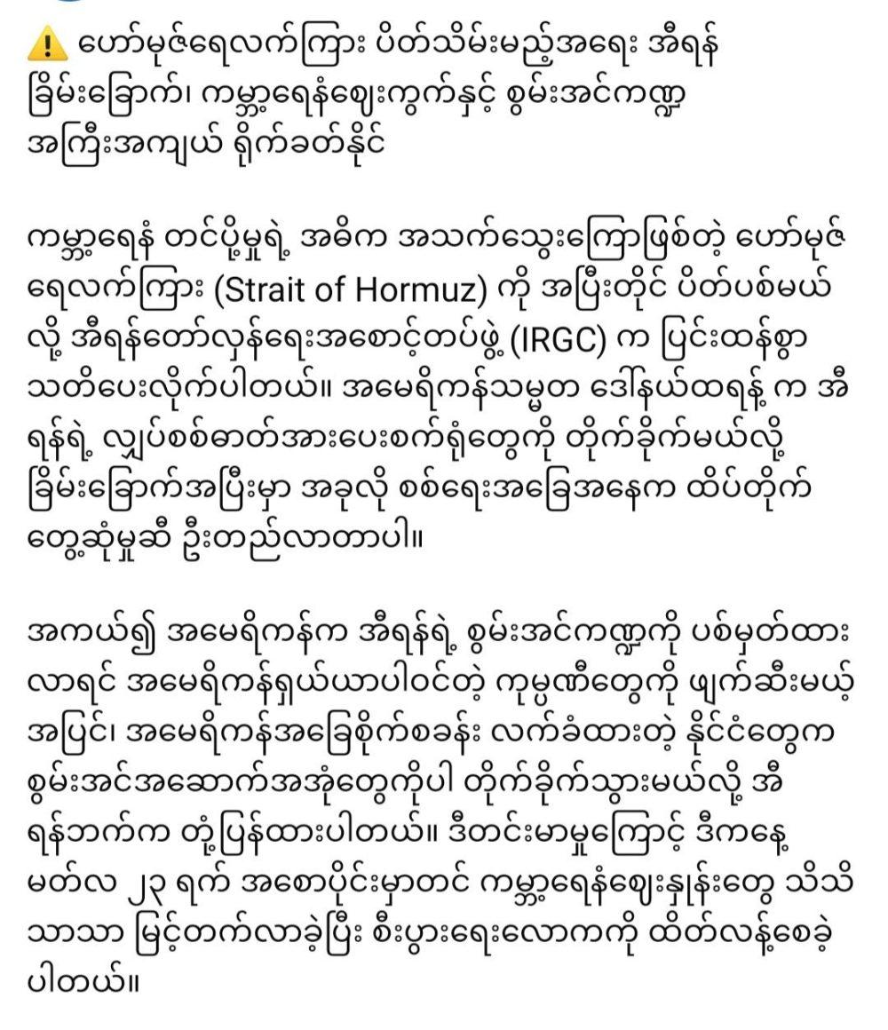 “ဟော်မုဇ် ရေလက်ကြားကို အပြီး ပိတ်ပစ်မယ်လို အီရန်က ပြောပြီ” March 24, 2026 admin News 0 “ဟော်မုဇ် ရေလက်ကြားကို အပြီး ပိတ်ပစ်မယ်လို အီရန်က ပြောပြီ”