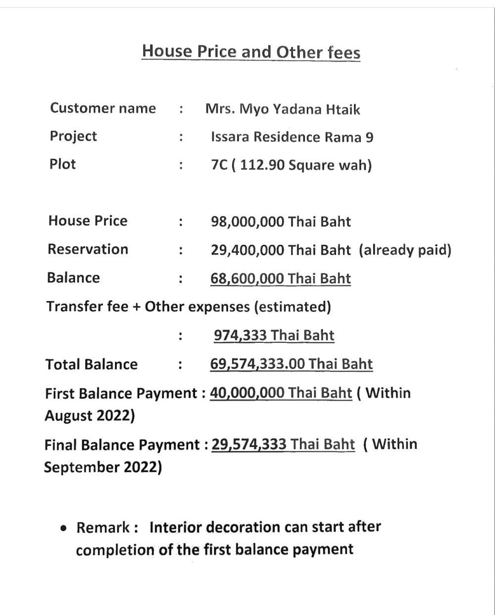 – မျိုးရတနာထိုက်အား ဝယ်ယူသူအဖြစ် စာရင်းသွင်းထားသော Charn Issara အိမ်ခြံမြေကုမ္ပဏီ၏ ဝယ်ယူစဉ် ငွေပေးချေရမည့်အကြိမ်ရေဖော်ပြထားသည့် အထောက်အထား-