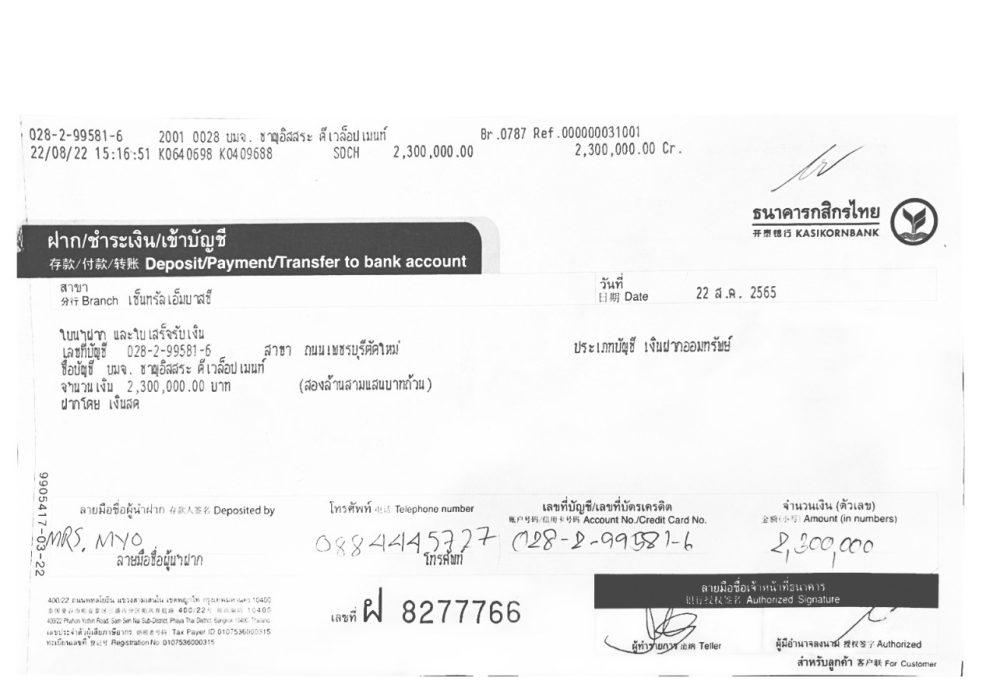 – Charn Issara သို့ မျိုးရတနာထိုက်အမည်ဖြင့် ငွေပေးချေမှု အထောက်အထား ဘဏ်ငွေလွှဲပြေစာ-