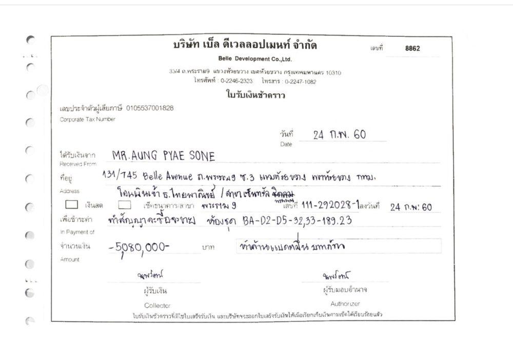 -131/999 အဆင့်မြင့်ကွန်ဒို တိုက်ခန်းအတွက် Belle Development သို့ အောင်ပြည့်စုံ၏ ငွေပေးချေမှု ပြေစာ အထောက်အထား –