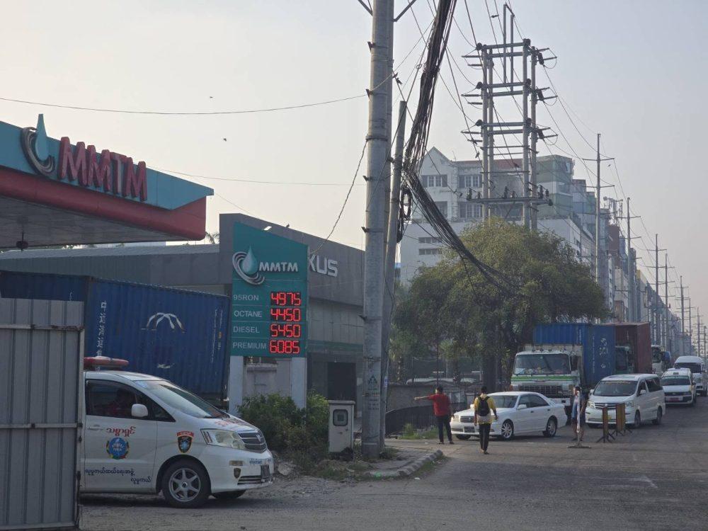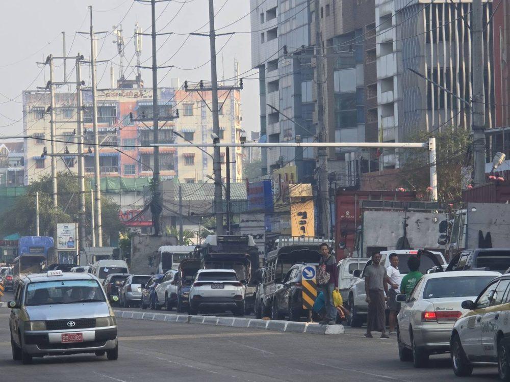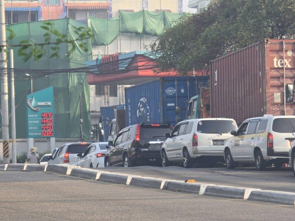 • မတ် ၂၇ ရက်မနက်ပိုင်းက ရန်ကုန်မြို့ရှိဆီဆိုင်တဆိုင်မှာတန်းစီနေတဲ့ကားတွေကို တွေ့ရစဥ်။ ဓာတ်ပုံ- People’s Spring