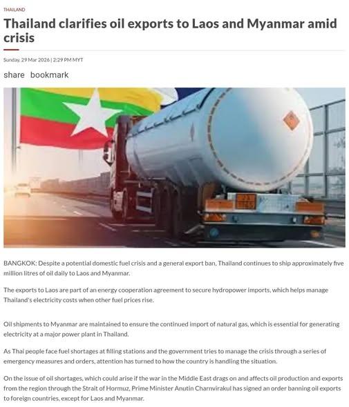 နေ့စဥ် လောင်စာဆီ လီတာပေါင်း(၃)သိန်းခန့် တင်ပို့လျက်ရှိကြောင်း ထိုင်းသတင်းမီဒီယာများက ဖော်ပြချက်အရသိရှိရသည်။