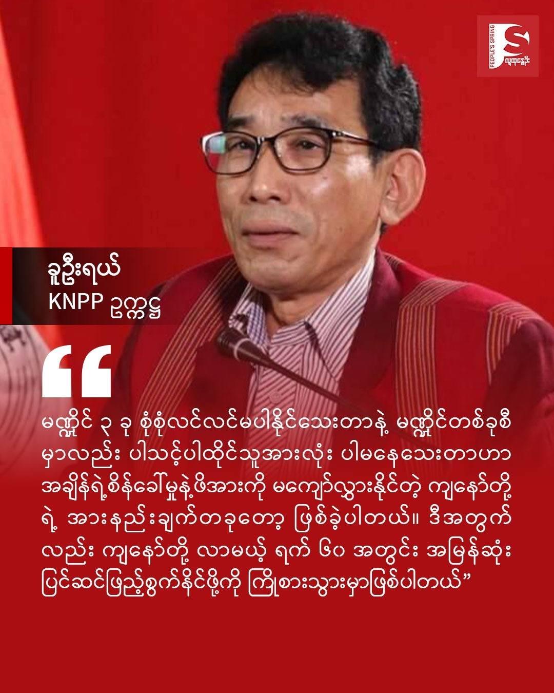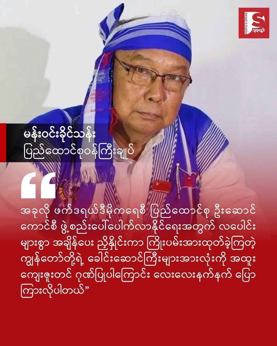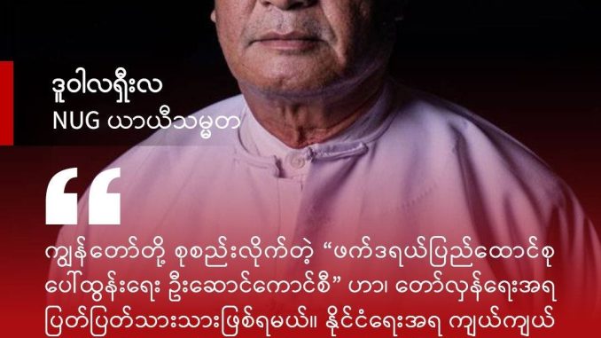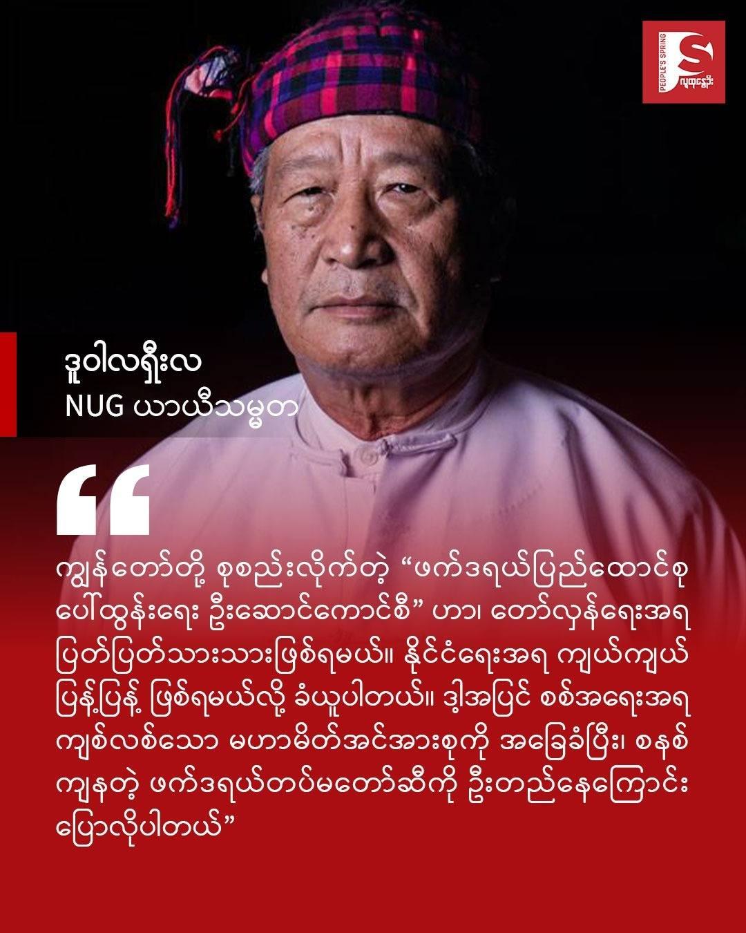 ဒီကနေ့ ကျွန်တော်တို့ တော်လှန်ရေးရဲ့ အဓိက ဦးတည်ချက်ဟာ အုပ်ချုပ်သူအပြောင်းအလဲပုံံစံ ပြုပြင်ပြောင်းလဲရေး ထက် သက်ဆိုင်သူအားလုံးပါဝင်သည့် ဖက်ဒရယ်ဒီမိုကရေစီပြည်ထောင်စုအသစ် တည်ဆောက် နိုင်ရေးအတွက် ဖြစ်တယ်ဆိုတာကို မြန်မာပြည်သူလူထုနဲ့ နိုင်ငံတကာအသိုင်းအဝိုင်းကို ထပ်မံ သက်သေပြလိုက်နိုင်ခြင်း ဖြစ်ပါတယ်။ တော်လှန်ရေး (၅)နှစ်ကြာ ကာလအထိတိုင်အောင် ကြံ့ကြံ့ခိုင် ရင်ဆိုင်နေကြတဲ့ မြန်
