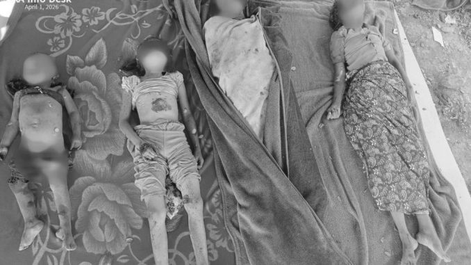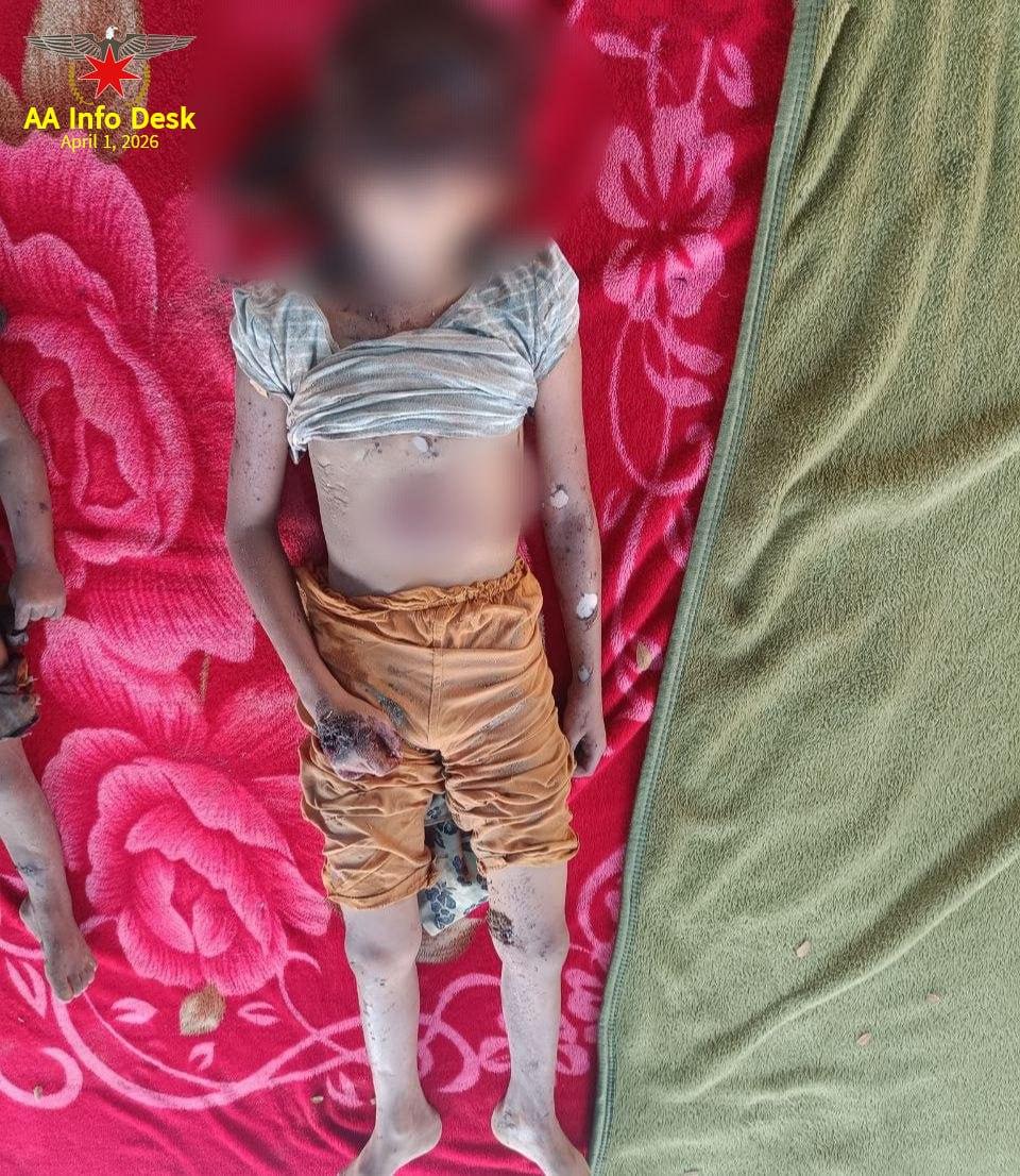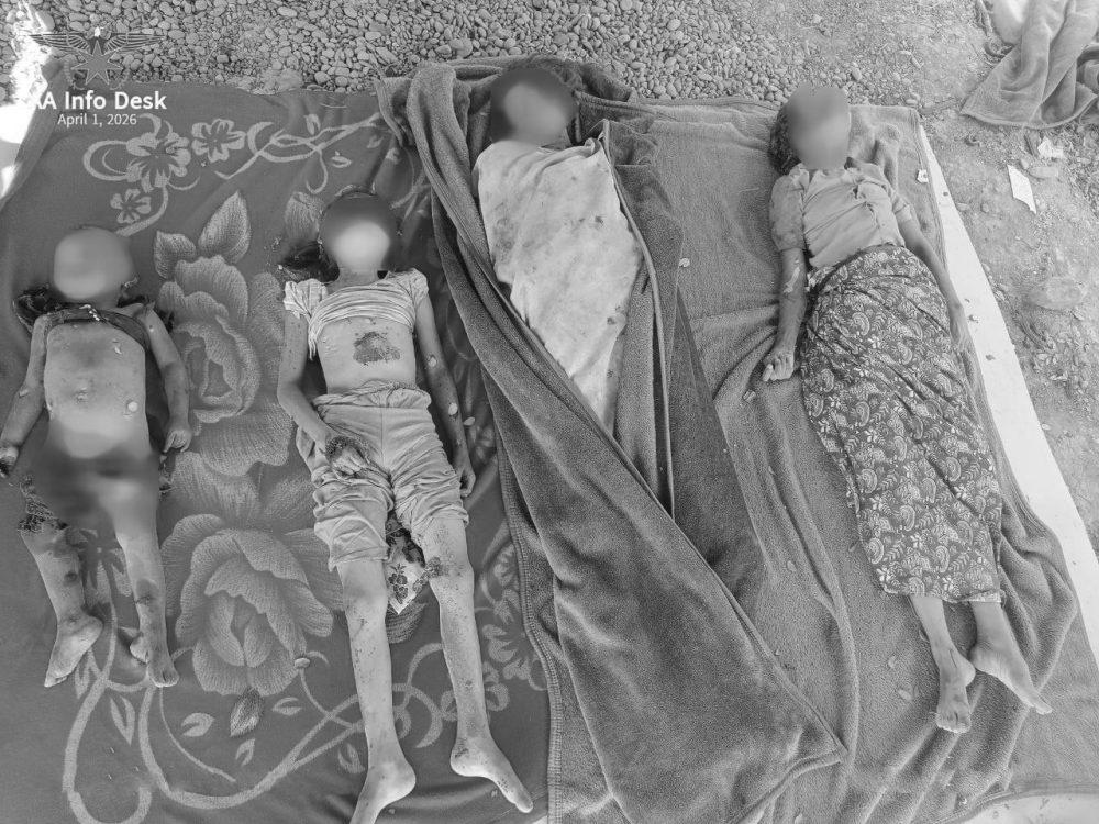 ရခိုင်ပြည်၊ သံတွဲမြိုနယ်ကို စစ်တပ်က တိုကလေယာဉ် ၄ စီးဖြင့် ဗုံးကျဲတိုက်ခိုက်မှု အသက် ၂ နှစ်နှင့် ၇ နှစ်အရွယ် ကလေး ၂ ဦး အပါအဝင် ပြည်သူ ၄ ဦးပါသည့် မိသားစုတစ်စုလုံး သေဆုံးသွားကြောင်း AA က သတင်းထုတ်ပြန်သည်။