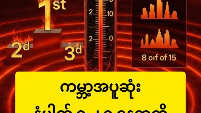 မြန်မာနိုင်ငံမှ မြို့ကြီးများမှာ ဧပြီ ၁ ရက်မှစတင်၍ ကမ္ဘာ့အပူဆုံးမြို့ ၁၅ မြို့စာရင်းတွင် အနည်းဆုံး မြို့လေးမြို့အထိ ဆက်တိုက်ပါဝင်နေခြင်းဖြစ်ကြောင်း Eldorado Weather ၏ ထုတ်ပြန်ချက်အရ သိရသည်။