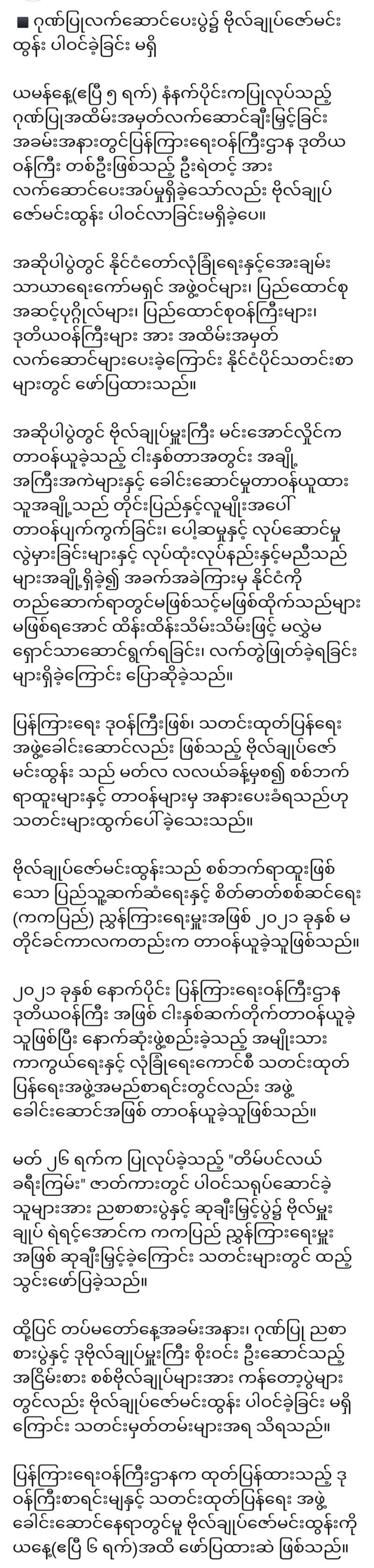 စစ်အာဏာသိမ်းမှုနှင့် မင်းအောင်လှိုင်ကို ကာကွယ်ပြောဆိုခဲ့သော အကြမ်းဖက် ဇော်မင်းထွန်းကို စစ်ဘက်နှင့် အရပ်ဘက် ရာထူးတာဝန်များအားလုံးမှ အနားပေး
