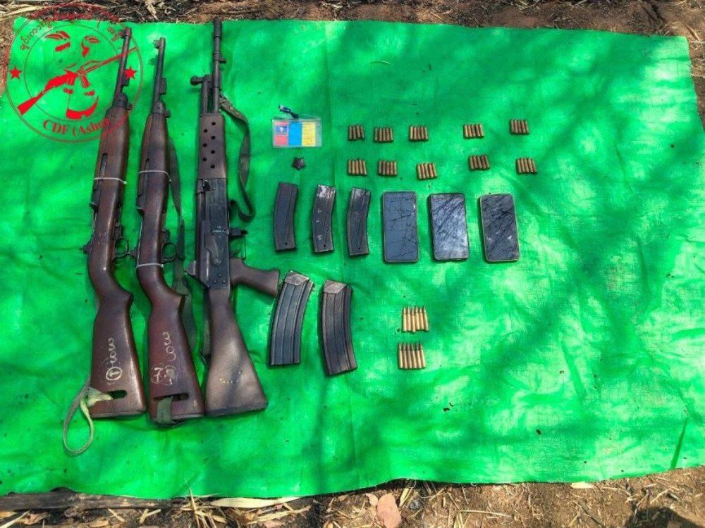 (စီးနင်းတိုက်ခိုက်ခဲ့တဲ့ နေရာနဲ့ သိမ်းဆည်းရရှိတဲ့ စစ်ကောင်စီတပ်ရဲ့ လက်နက်ခဲယမ်းတချို့။ ဓာတ်ပုံ – CDF-Asho