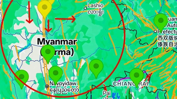 🟠M 4.8 ရဲ့ နောက်ဆက်တွဲအနေနဲ့ ငလျင်ကြီးရဲ့ မြောက်ဘက်အက်ကွဲကြောင်းအစွန်း ကျောက်မြောင်း~စဥ်ကူးအပိုင်းမှာနေ့လယ် ၁၂ နာရီ၀န်း