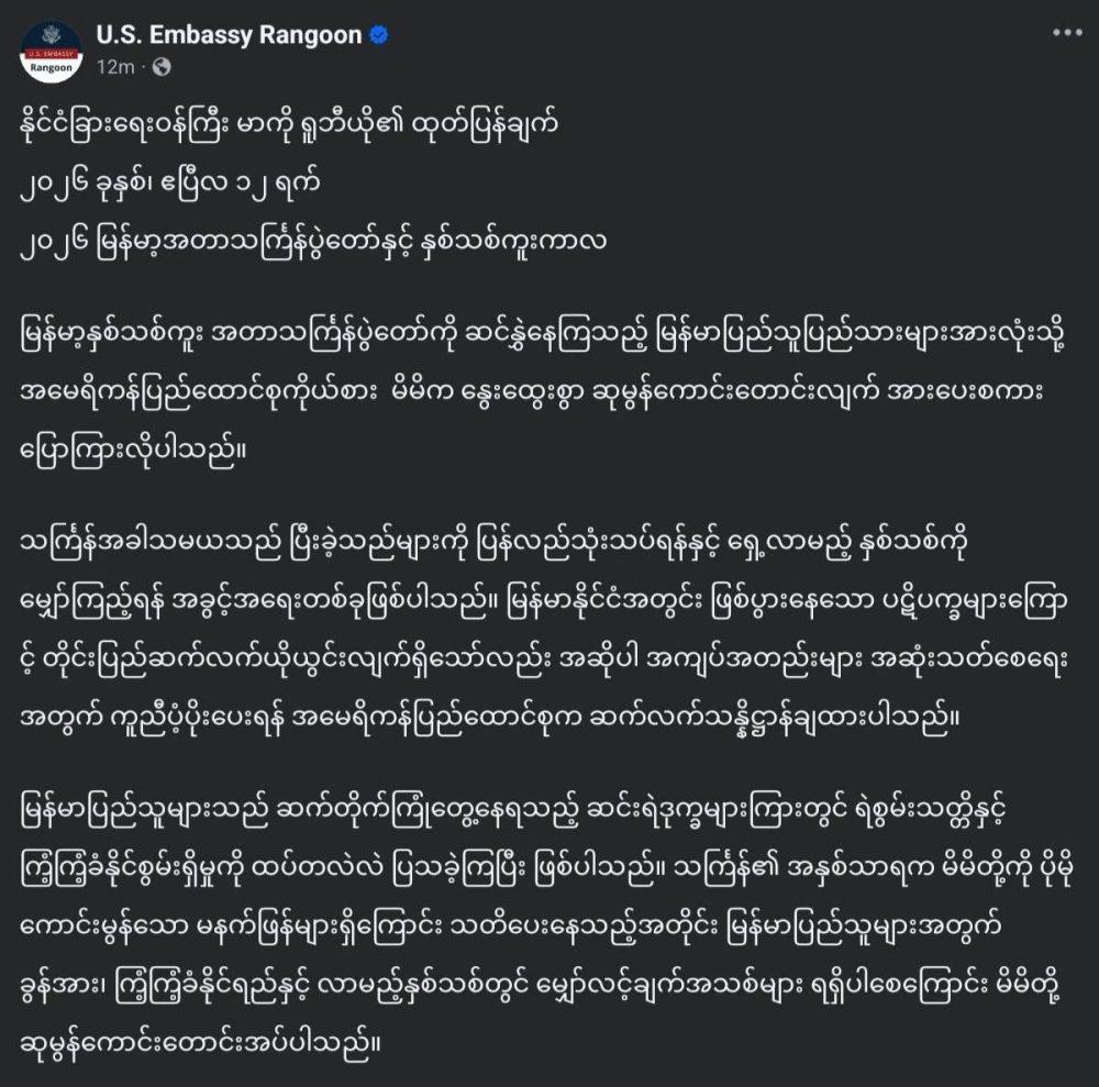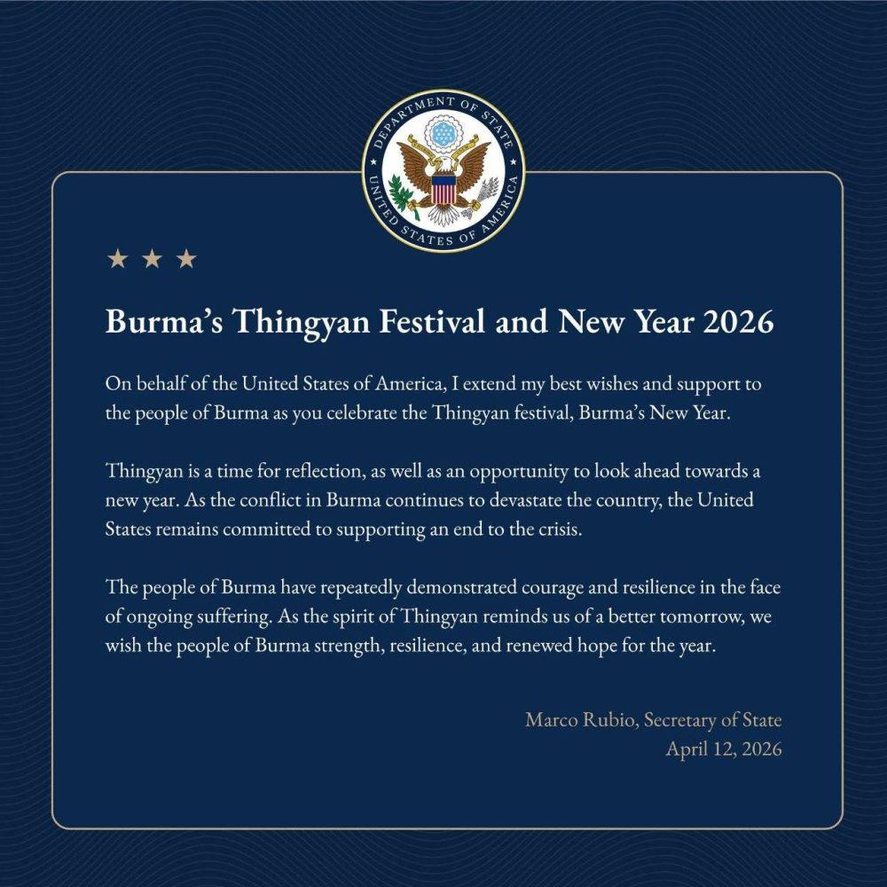 သင်္ကြန်အခါသမယသည် ပြီးခဲ့သည်များကို ပြန်လည်သုံးသပ်ရန်နှင့် ရှေ့လာမည့် နှစ်သစ်ကို မျှော်ကြည့်ရန် အခွင့်အရေးတစ်ခုဖြစ်ပါသည်။ မြန်မာနိုင်ငံအတွင်း ဖြစ်ပွားနေသော ပဋိပက္ခများကြောင့် တိုင်းပြည်ဆက်လက်ယိုယွင်းလျက်ရှိသော်လည်း အဆိုပါ အကျပ်အတည်းများ အဆုံးသတ်စေရေးအတွက် ကူညီပံ့ပိုးပေးရန် အမေရိကန်ပြည်ထောင်စုက ဆက်လက်သန္နိဋ္ဌာန်ချထားပါသည်။