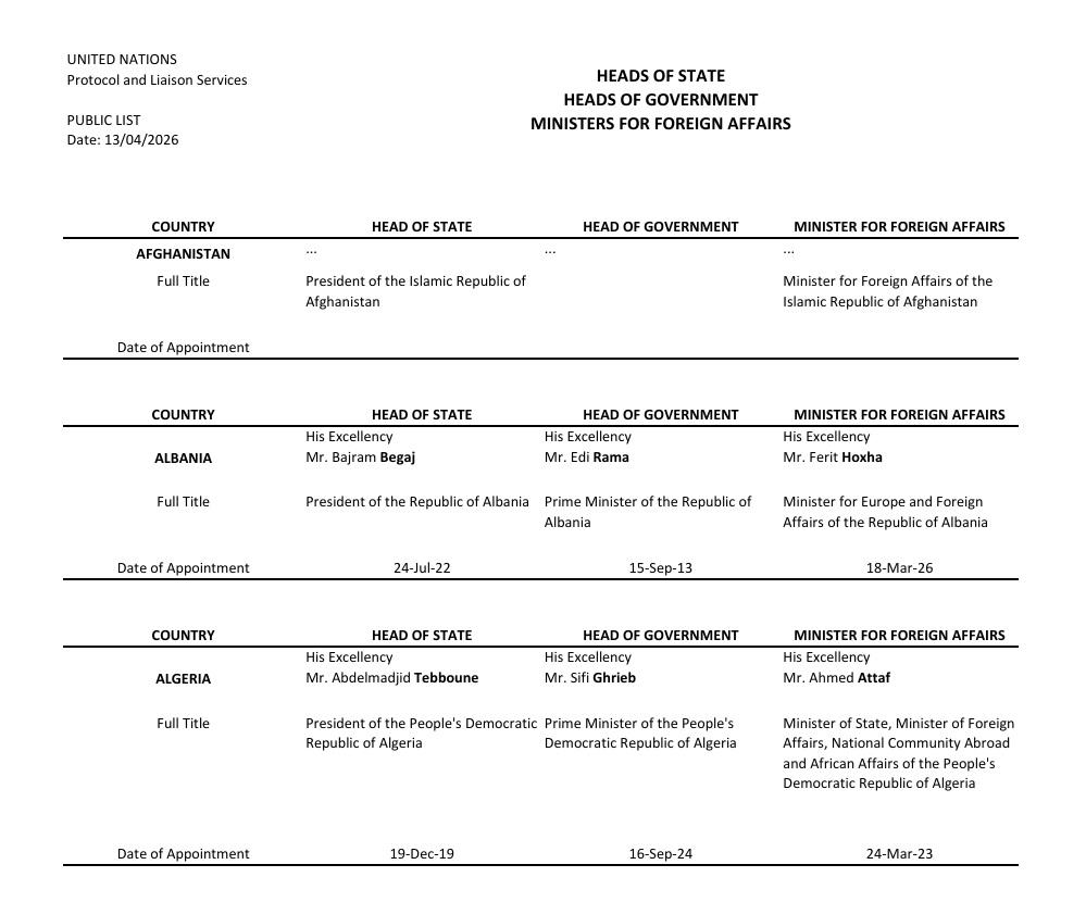 ၂၀၂၆ ခုနှစ် ဧပြီလ ၁၃ ရက်နေ့ ကုလသမဂ္ဂက အသိအမှတ်ပြုထားသော ကမ္ဘာ့နိုင်ငံခေါင်းဆောင်များ၏ စာရင်းကို https://www.un.org/…/Documents_Protocol/hspmfmlist.pdf… တွင်သွားရောက်ကြည့်ရှုနိုင်ပါသည်။