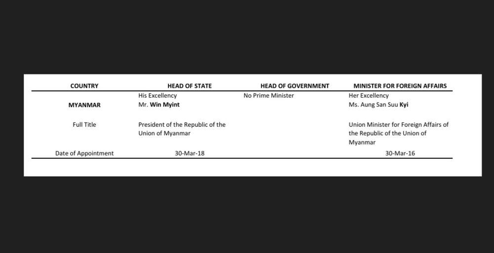 ကုလသမဂ္ဂ၏ နိုင်ငံအကြီးအကဲများစာရင်းတွင် မြန်မာနိုင်ငံတော်အကြီးအကဲအဖြစ် ၂၀၁၈ ခုနှစ်၊ မတ်လ ၃၀ ရက်နေ့ သမ္မတ ဖြစ်လာသော သမ္မတ ဦးဝင်းမြင့်၊ ၂၀၁၆ ခုနှစ် မတ်လ ၃၀ ရက်နေ့ နိုင်ငံတော်၏ အတိုင်ပင်ခံပုဂ္ဂိုလ်နှင့် နိုင်ငံခြားရေးဝန်ကြီး ဖြစ်လာသော ဒေါ်အောင်ဆန်းစုကြည်တို့၏ အမည်စာရင်းများကိုသာ ဆက်လက်ဖော် ပြထားခြင်းဖြစ်သည်။