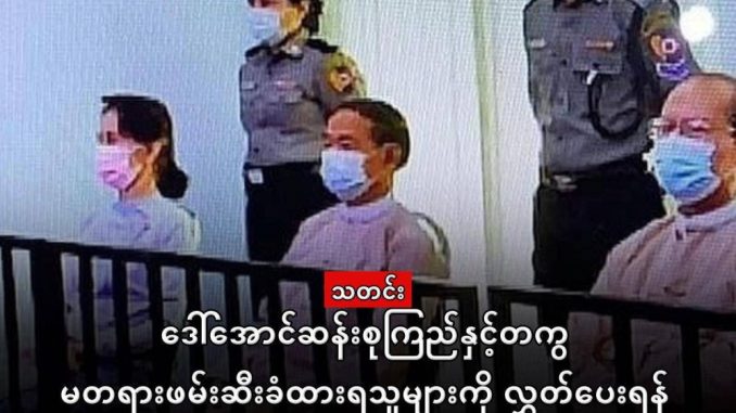 ဓာတ်ပုံ – စစ်အုပ်စုထံ ဖမ်းဆီးခံထားရသော ဒေါ်အောင်ဆန်းစုကြည်၊ သမ္မတ ဦးဝင်းမြင့်နှင့် ဒေါက်တာမျိုးအောင်တို့ကို နေပြည်တော်တရားခွင်တခုတွင် အာဏာသိမ်းအစောပိုင်းကာလက တွေ့ရစဉ်။ နိုင်ငံတော်၏ အတိုင်ပင်ခံပုဂ္ဂိုလ် ဒေါ်အောင်ဆန်းစုကြည်၊ သမ္မတ ဦးဝင်းမြင့်နှင့်တကွ မတရားဖမ်းဆီးခံထားရသူအားလုံးကို လွှတ်ပေးရန် အမျိုးသားညီညွတ်ရေးအစိုးရ (NUG) ယာယီသမ္မတ ဒူဝါလရှီးလက ယနေ့ (ဧပြီ ၁၆) တွင် တောင်းဆိုလိုက်သည်။