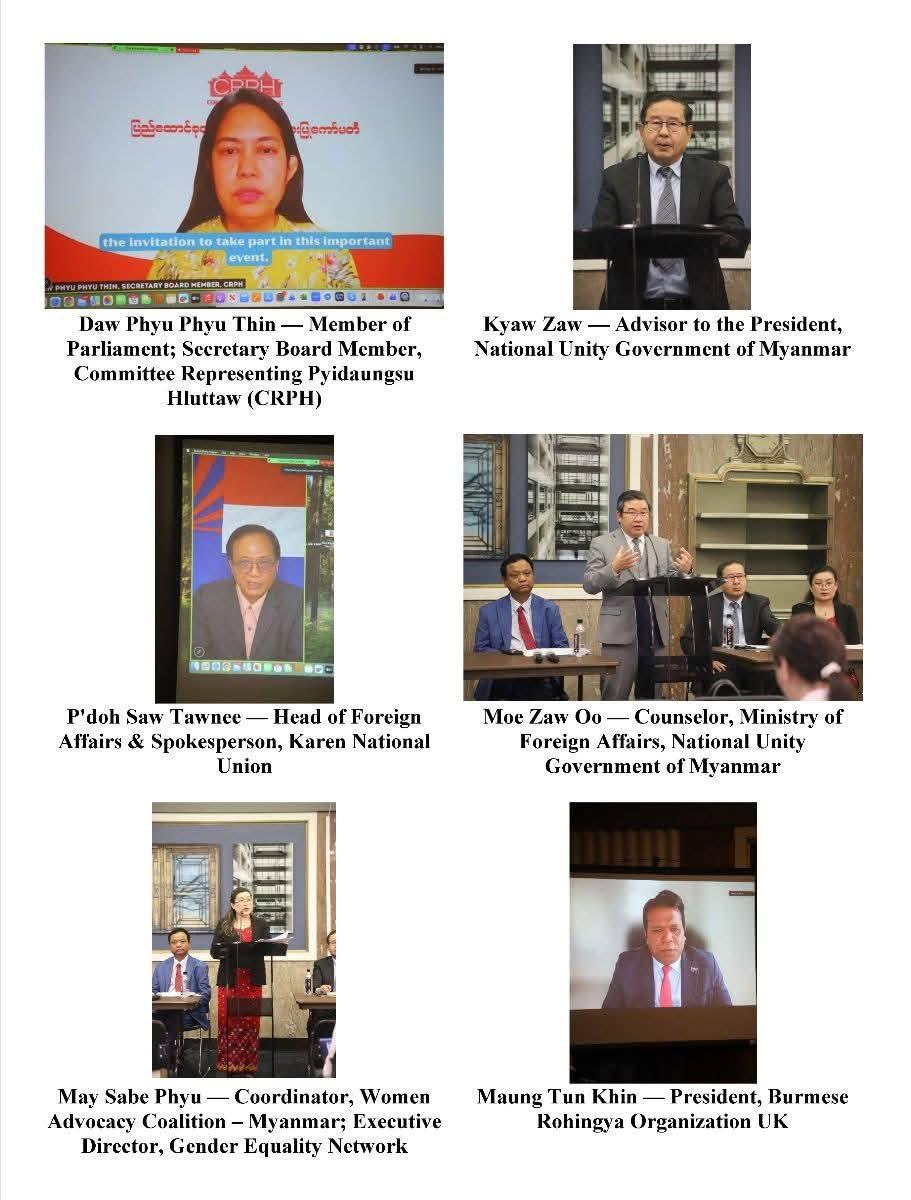 အဆိုပါ ဆွေးနွေးပွဲသို့ မြန်မာ့အရေး ကျွမ်းကျင်သူများနှင့် တိုင်းရင်းသားခေါင်းဆောင်များလည်းဖြစ်တက်ရောက်ခဲ့ကြပြီး ဦးကျော်ဇော် (NUG သမ္မတ၏ အကြံပေး)၊ပဒိုစောတောနီး (KNU ပြောရေးဆိုခွင့်ရှိသူ)၊ဦးမိုးဇော်ဦး (NUG နိုင်ငံခြားရေးဝန်ကြီးဌာန အကြံပေး)၊