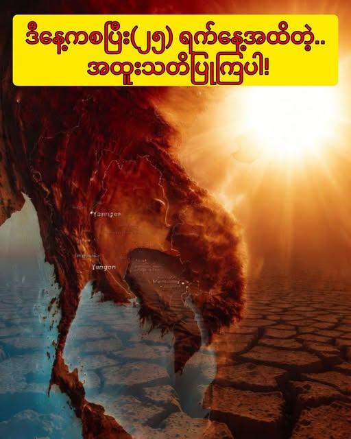 ယနေ့ ဧပြီလ (၂၅) ရက်နေ့အထိ မြန်မာနိုင်ငံအထက်ပိုင်းနဲ့ အလယ်ပိုင်းဒေသတွေမှာ လက်ရှိထက် အပူချိန် သိသိသာသာ ထပ်မံမြင့်တက်လာဖို့ ရှိနေပါတယ်လို့ မိုးလေဝသခန့်မှန်းသူ ဒေါက်တာစိုင်းခွန်အာကာက သတိပေးထားတာပါ။ အပူဒဏ်အန္တရာယ်ဟာ နောက်ပြောင်ရမယ့်ကိစ္စမဟုတ်လို့ မိမိတို့ရဲ့ မိသားစုဝင်တွေ၊ နီးစပ်ရာမိတ်ဆွေတွေကို အမြန်ဆုံး သတိပေးလိုက်ကြပါဦး။