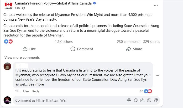 မြန်မာနှစ်သစ်ကူးကာလ လွတ်ငြိမ်းချမ်းသာခွင့်ဖြင့် အကျဉ်းသား ၄,၅၀၀ ကျော် လွတ်မြောက်လာရာတွင် သမ္မတဦးဝင်းမြင့် ပါဝင်လာခြင်းအပေါ် ကနေဒါနိုင်ငံက ကြိုဆိုကြောင်း ယမန်နေ့ တရားဝင် ကြေညာချက်ထုတ်ပြန်သည်။