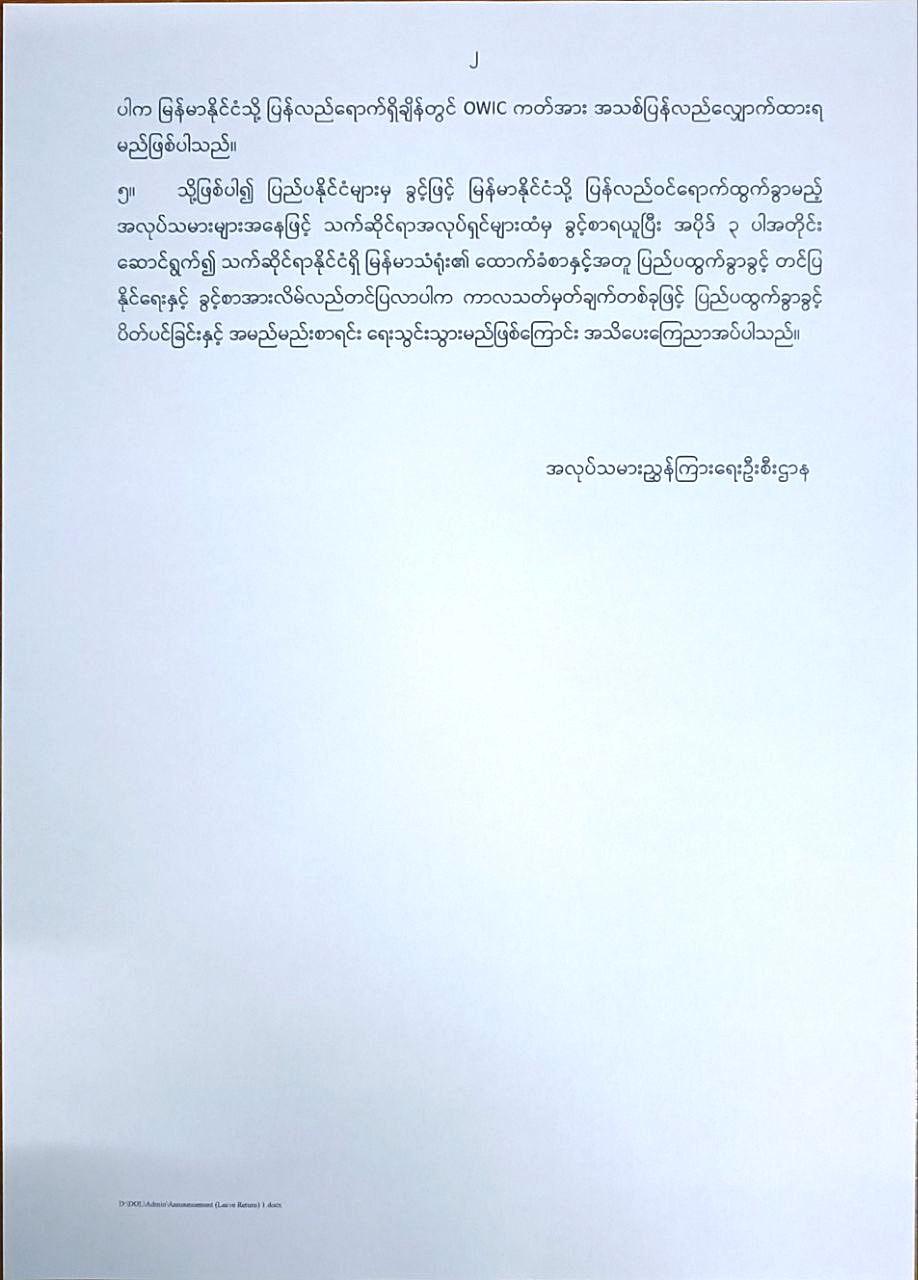 ပြည်ပရောက် မြန်မာအလုပ်သမားများ မြန်မာနိုင်ငံသို့ ခွင့်ဖြင့် ပြန်လာမည်ဆိုပါက သက်ဆိုင်ရာ မြန်မာသံရုံး ထောက်ခံစာ ယူဆောင်လာရမည်ဖြစ်ပြီး ညွှန်ကြားချက် မလိုက်နာလျှင် ပြည်ပထွက်ခွာခွင့်ပိတ်ကာ အမည်ပျက်စာရင်းသွင်းမည်ဟု အမိန့် ထုတ်