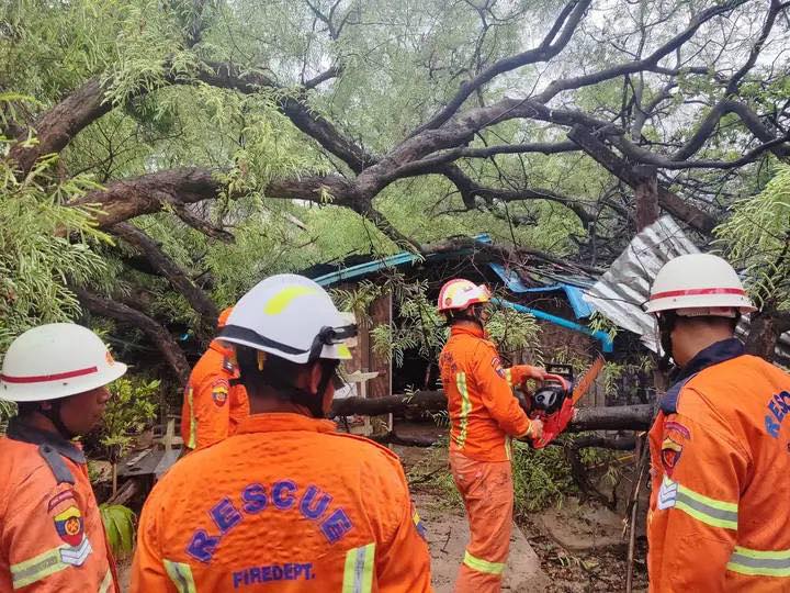 (ပျော်ဘွယ်မြို့နယ်တွင် လေပြင်းကြောင့် ပျက်စီးခဲ့သော နေအိမ်အချို့အား တွေ့ရစဥ်။ ဓာတ်ပုံ-ပျော်ဘွယ်မီးသတ်)