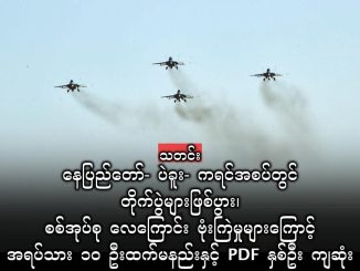 နေပြည်တော်- ပဲခူး- ကရင်အစပ်တွင် တိုက်ပွဲများဖြစ်ပွား၊ စစ်အုပ်စု လေကြောင်း ဗုံးကြဲမှုများကြောင့် အရပ်သား ၁၀ ဦးထက်မနည်းနှင့် PDF နှစ်ဦး ကျဆုံး YT မဇ္ဈိမ။ ။ နေပြည်တော်- ပဲခူး- ကရင် နယ်စပ်မျဉ်းအနီး သံတောင်ကြီးမြို့နယ် မြောက်ပိုင်းရှိ ကျေးရွာများ၌ တိုက်ပွဲများ ဖြစ်ပွားနေပြီး […]